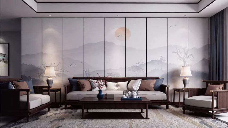 将中式经典元素提炼并加以丰富,注入现代文化气息的的新中式风格背景墙 。